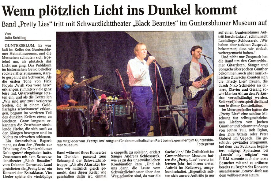 Finthen. Kleine, schöne Lügen waren am Samstag wieder in Finthen zu hören. Genauso wie die stilvoll interpretierten Songs der Rolling Stones, von Pink Floyd oder Bob Marley. "Pretty Lies" sind aber nicht einfach nur eine Band. Sie sind ein Konzept. Kernstück der ¯ nach einem Baukastenprinzip funktionierenden ¯ Band ist das Duo, Jochen Günther und Niko Schneider. Mit kunstvollen Gitarrenklängen und unvergleichlichen Stimmen stehen sie häufig nur als "Pretty Lies Light" auf der Bühne.