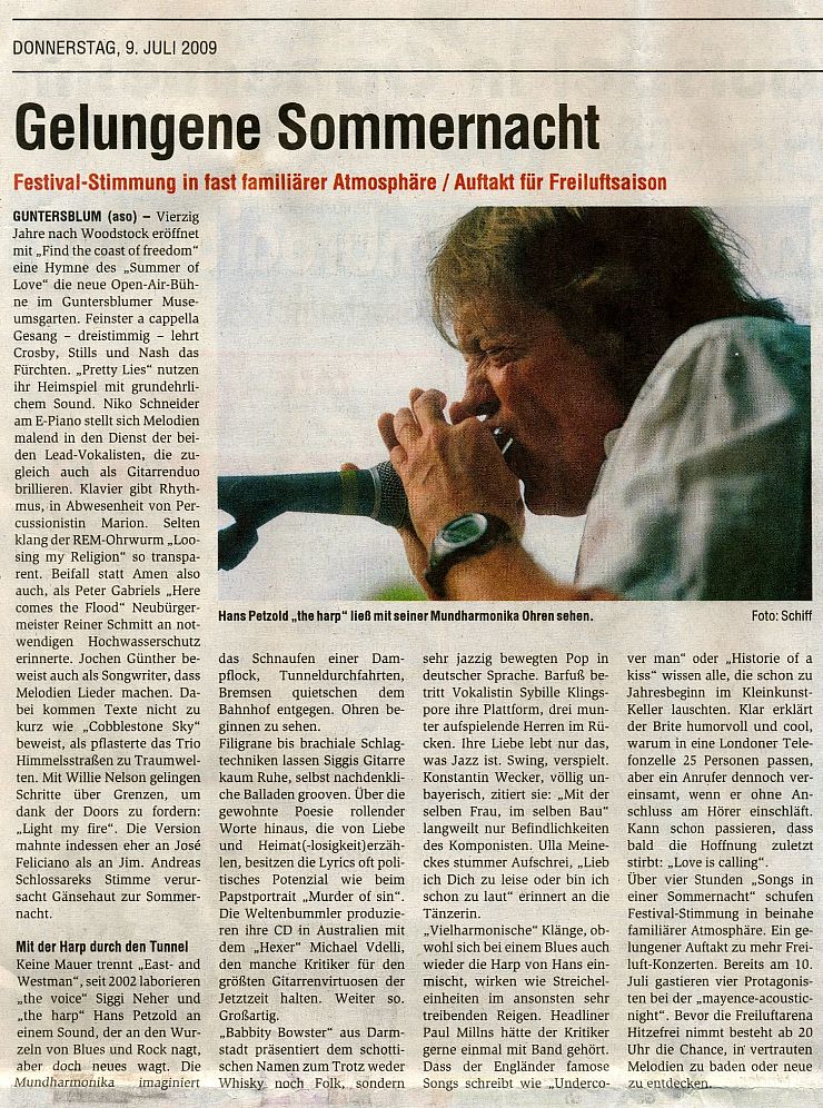 Der Publikumsrenner ist an diesem Samstag in Mainz sein Lied "Traces". Die Band sucht sich ihre Lieder immer rein intuitiv aus. "Es braucht einen guten Text und eine tolle Melodie. Und der Song muss uns liegen", bemerkt Günther. Und sie treten nur dort auf, wo ihre Musik und die Lokalität zusammen passen. Das Publikum war begeistert. Liedwünsche wurden auch nur zu gerne erfüllt.